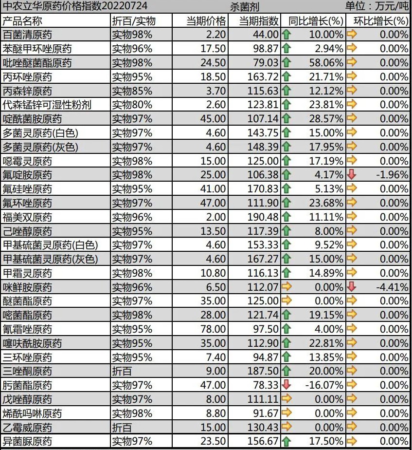 多菌靈原藥生產(chǎn)廠家環(huán)保壓力較大,市場(chǎng)報(bào)價(jià)維持在4.6萬(wàn)元/噸左右;甲基硫菌靈原藥成本壓力大,市場(chǎng)價(jià)格報(bào)到4.6萬(wàn)元/噸左右;噁霉靈原藥市場(chǎng)價(jià)格在15萬(wàn)元/噸左右;氟啶胺原藥庫(kù)存消化,出口市場(chǎng)良好,市場(chǎng)價(jià)格回落到25萬(wàn)元/噸;咪鮮胺原藥市場(chǎng)弱勢(shì),廠家成本高位,艱難維持,價(jià)格上調(diào)到6.5萬(wàn)元/噸。