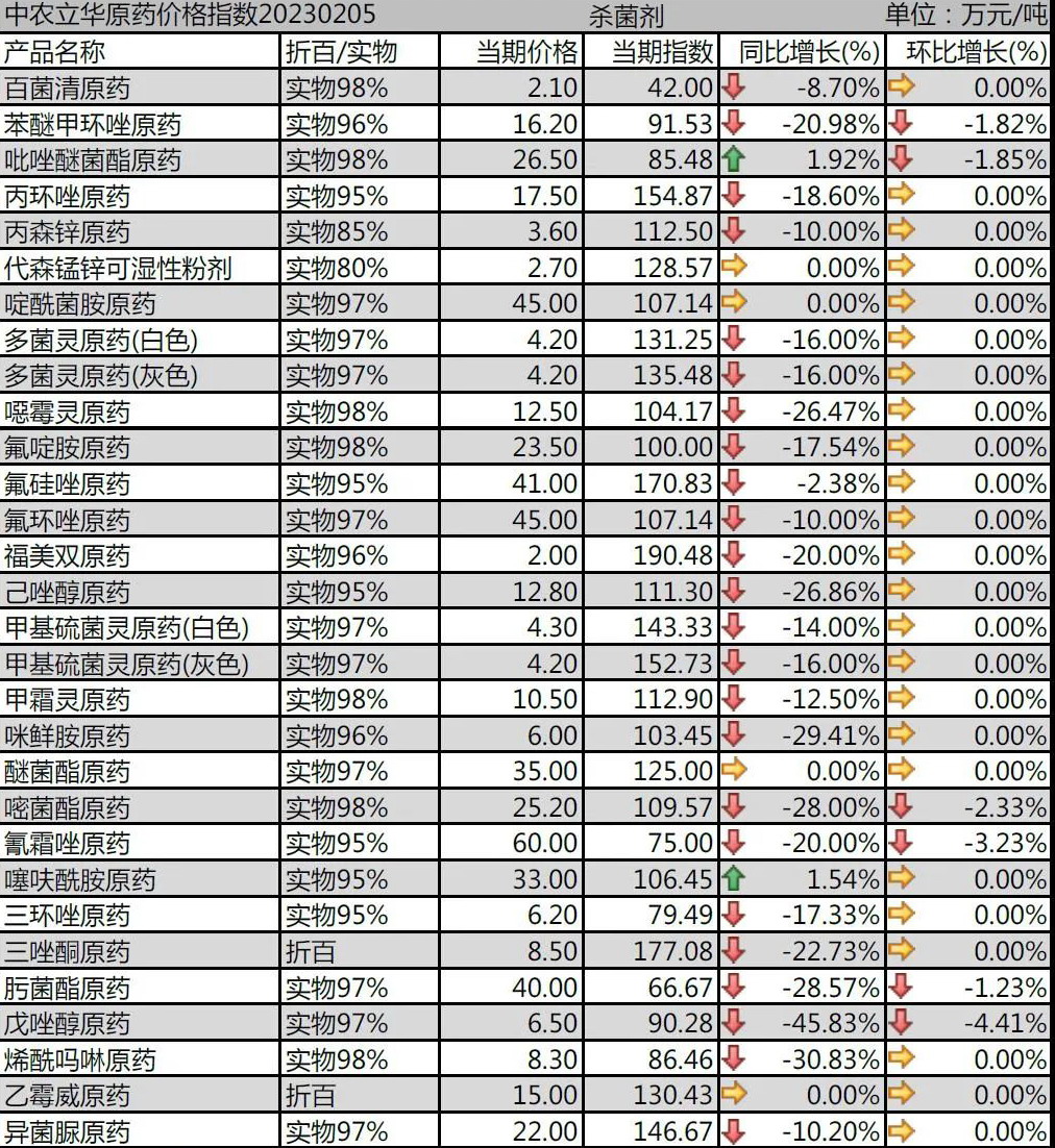 三唑類產(chǎn)品需求弱勢(shì),價(jià)格處于低位,廠家競(jìng)爭(zhēng)激烈:苯醚甲環(huán)唑原藥報(bào)到16.2萬(wàn)元/噸;丙環(huán)唑原藥報(bào)到17.5萬(wàn)元/噸;己唑醇原藥價(jià)格報(bào)到12.8萬(wàn)元/噸;戊唑醇原藥廠家報(bào)到6.5萬(wàn)元/噸,小廠價(jià)格沖擊大;三環(huán)唑原藥價(jià)格報(bào)到6.2萬(wàn)元/噸;氟環(huán)唑原藥廠家排單較多,價(jià)格到45萬(wàn)元/噸。