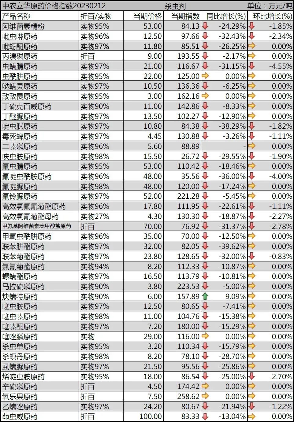 噠螨靈原藥報價到10.5萬元/噸;螺螨酯原藥庫存低位,現(xiàn)貨偏緊,廠家交前期淡儲訂單,價格報到16.5萬元/噸;炔螨特原藥廠家排單為主,現(xiàn)貨緊缺,市場報到6萬元/噸;茚蟲威原藥價格報到100萬元/噸。