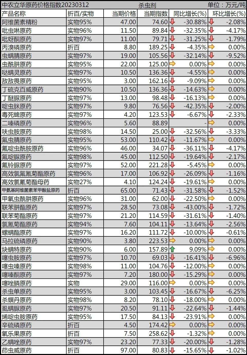 噠螨靈原藥市場價格穩(wěn)定,報價到10.5萬元/噸;螺螨酯原藥庫存低位,現(xiàn)貨偏緊,廠家交前期淡儲訂單,價格報到16.2萬元/噸;炔螨特原藥廠家排單為主,現(xiàn)貨緊缺,市場報到6萬元/噸;茚蟲威原藥價格逐步下行,報價97萬元/噸。