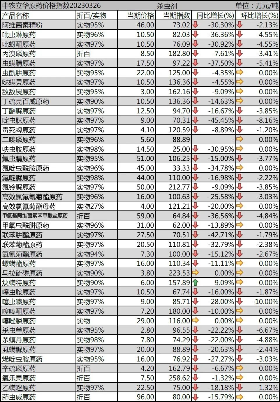 噠螨靈原藥市場價格穩(wěn)定,報價到10.5萬元/噸;螺螨酯原藥庫存低位,現(xiàn)貨偏緊,廠家交前期淡儲訂單,價格報到16萬元/噸;炔螨特原藥廠家排單為主,現(xiàn)貨緊缺,市場報到6萬元/噸;茚蟲威原藥價格報到96萬元/噸。