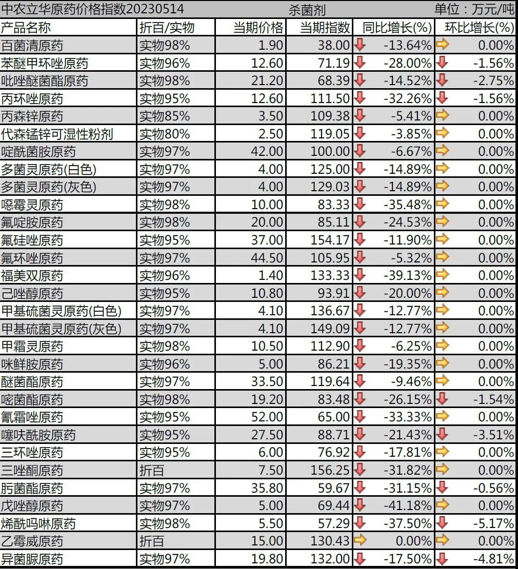 多菌靈原藥市場穩(wěn)定為主,報價在4萬元/噸;甲基硫菌靈原藥市場貨源緊張,廠家排單為主,價格報到4.1萬元/噸;福美雙原藥價格1.4萬元/噸;甲霜靈原藥價格報到10.5萬元/噸;噁霉靈原藥市場價格報至10萬元/噸;氟啶胺原藥目前價格報20萬元/噸;咪鮮胺原藥廠家開工率提升,終端客戶消化庫存為主,市場報到5萬元/噸。