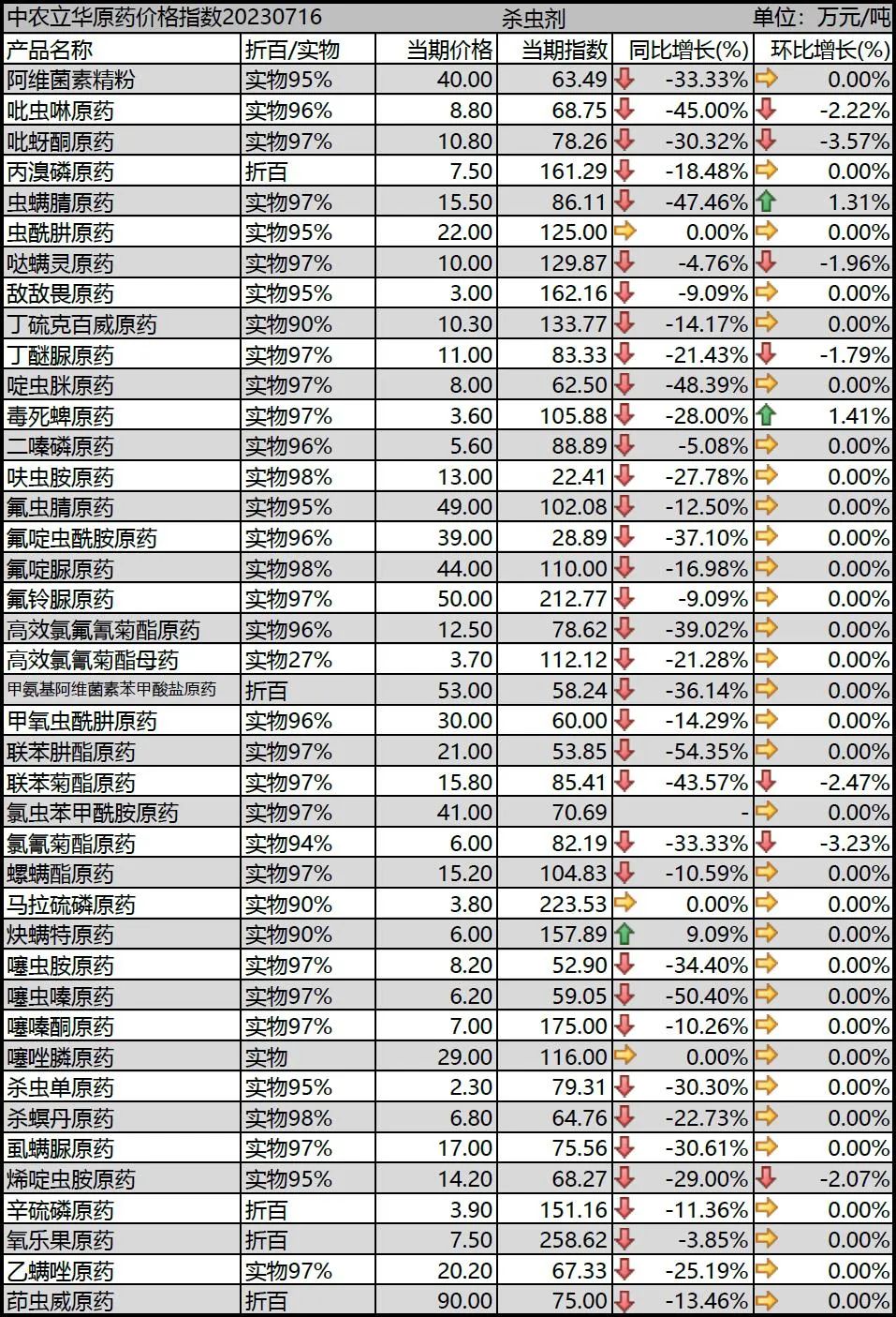 阿維系列產(chǎn)品市場(chǎng)受氯蟲(chóng)苯甲酰胺國(guó)產(chǎn)化影響的沖擊較大,廠家?guī)齑嫦,市?chǎng)開(kāi)工率有所降低。下游剛需備貨,上游降價(jià)意愿降低。阿維菌素精粉報(bào)到40萬(wàn)元/噸;甲氨基阿維菌素苯甲酸鹽原藥市場(chǎng)備貨逐步開(kāi)啟,廠家降開(kāi)工負(fù)荷,市場(chǎng)消化庫(kù)存,成交量攀升,價(jià)格觸底反彈,報(bào)到53萬(wàn)元/噸。