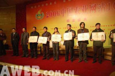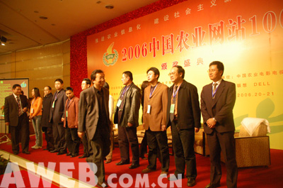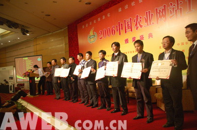 農(nóng)博網(wǎng)訊 2006年12月20日-21日,由農(nóng)業(yè)部信息中心、中國互聯(lián)網(wǎng)協(xié)會、中國電子商務(wù)協(xié)會共同主辦,農(nóng)博網(wǎng)獨(dú)家承辦的“推進(jìn)農(nóng)業(yè)信息化 建設(shè)社會主義新農(nóng)村”高層論壇暨“2006中國農(nóng)業(yè)網(wǎng)站100強(qiáng)頒獎盛典”在北京梅地亞中心盛大召開。農(nóng)博網(wǎng)進(jìn)行全程圖文直播和在線視頻直播。圖為2006中國農(nóng)業(yè)網(wǎng)站百強(qiáng)行業(yè)網(wǎng)站頒獎現(xiàn)場。