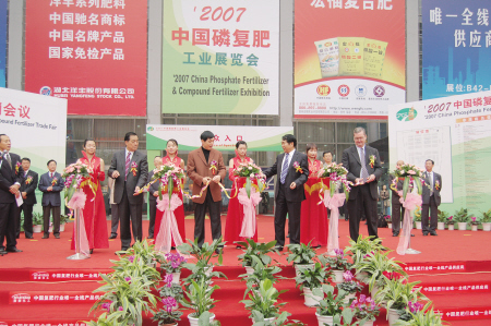 中華全國供銷合作總社理事會副主任顧國新、四川省副省長郭永祥、中國石化工業(yè)協(xié)會會長李勇武等為第八屆磷復(fù)肥產(chǎn)銷會剪彩。