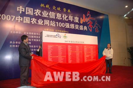 由農(nóng)業(yè)部信息中心、中國互聯(lián)網(wǎng)協(xié)會(huì)、中國電子商務(wù)協(xié)會(huì)共同主辦,農(nóng)博網(wǎng)承辦的中國農(nóng)業(yè)信息化年度峰會(huì)暨2007中國農(nóng)業(yè)網(wǎng)站100強(qiáng)頒獎(jiǎng)盛典12月20日在北京梅地亞中心隆重舉行。