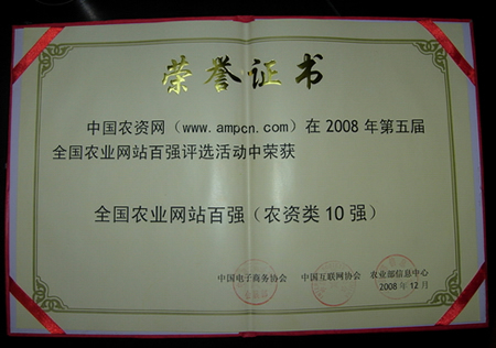 2008年12月20日,中國農(nóng)業(yè)信息化年度峰會暨2008中國農(nóng)業(yè)網(wǎng)站百強(qiáng)頒獎(jiǎng)盛典在北京隆重舉行。農(nóng)資網(wǎng)在一年一度的農(nóng)業(yè)網(wǎng)站百強(qiáng)評比中,再度名列百強(qiáng)前茅,至此,已蟬聯(lián)五屆。