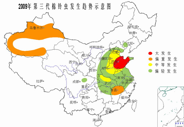 據(jù)不完全統(tǒng)計(jì),2009年全國(guó)棉花種植面積為7300多萬(wàn)畝,黃河流域和長(zhǎng)江流域棉區(qū)抗蟲(chóng)棉種植比率均在90%以上,但棉花生長(zhǎng)中后期抗蟲(chóng)性普遍下降,加之品種間抗蟲(chóng)性差異大,利于三、四代棉鈴蟲(chóng)發(fā)生;且抗蟲(chóng)棉田用藥減少,有利于棉蚜、棉葉螨、棉盲蝽、煙粉虱等刺吸性害蟲(chóng)及枯黃萎病等病害的發(fā)生。全國(guó)大部棉區(qū)秋季作物長(zhǎng)勢(shì)良好,棉田間套作面積占一定比例,為棉鈴蟲(chóng)、棉盲蝽、煙粉虱等害蟲(chóng)的發(fā)生繁殖和轉(zhuǎn)移危害提供了良好的寄主條件。