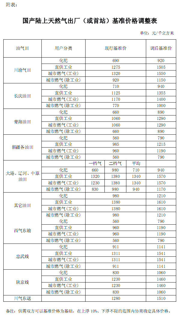 附:國(guó)產(chǎn)陸上天然氣出廠(或首站)基準(zhǔn)價(jià)格調(diào)整表