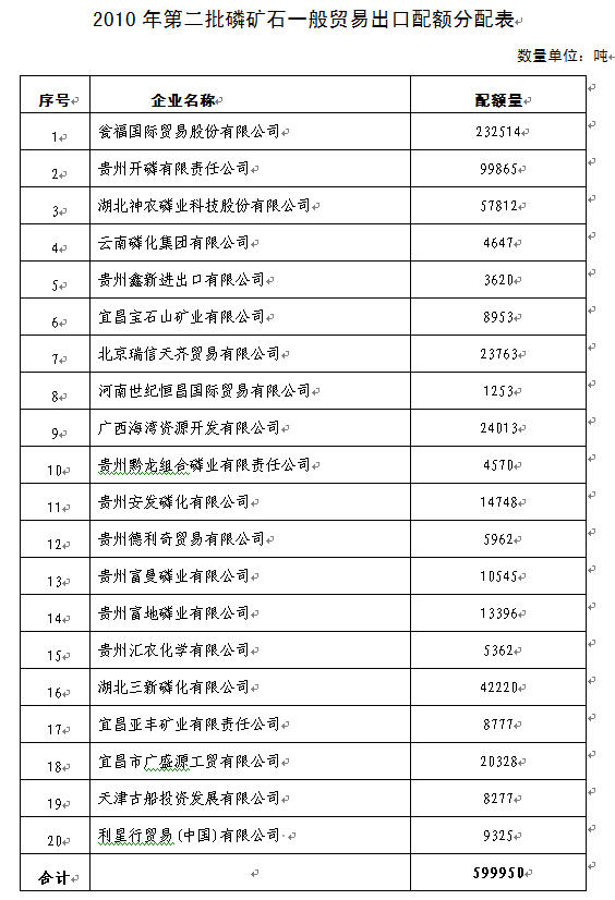 一、2010年第二批磷礦石一般貿(mào)易出口配額下達量為599950噸。