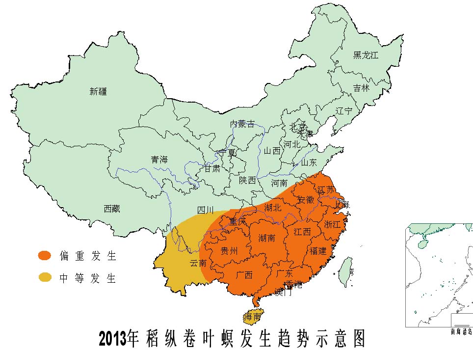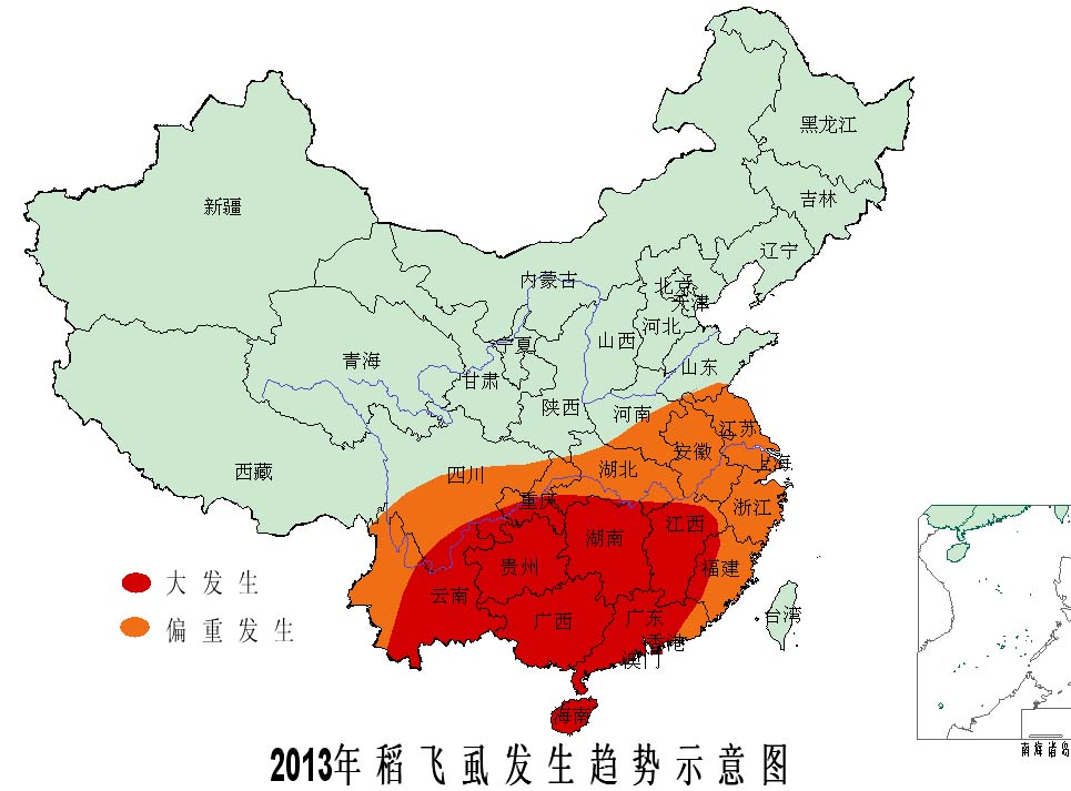 據(jù)國(guó)家氣候中心預(yù)測(cè),2012/2013年冬季,我國(guó)華南、西南南部和江南南部“兩遷”害蟲(chóng)越冬稻區(qū)氣溫接近常年或稍偏高,降水正常或略偏少;境外蟲(chóng)源地中南半島和泰緬北部降水明顯偏多,氣溫偏高,境內(nèi)外蟲(chóng)源地總體大氣熱量和水分條件對(duì)“兩遷”害蟲(chóng)越冬存活和繁殖比上年有利;2013年春季,華南、西南大部地區(qū)氣溫偏高,西南南部降水偏多,將導(dǎo)致“兩遷”害蟲(chóng)遷入期提前,華南南部、西南南部、江南稻區(qū)局部遷入量偏大。目前我國(guó)水稻主栽品種仍以粗稈大穗、優(yōu)質(zhì)高產(chǎn)型為主,生長(zhǎng)量大、田間郁閉,易形成適溫高濕的田間生境;同時(shí),水稻栽插期和生育期不一,單、雙季稻混栽,橋梁田多,有利于遷飛性害蟲(chóng)發(fā)生和輾轉(zhuǎn)為害。