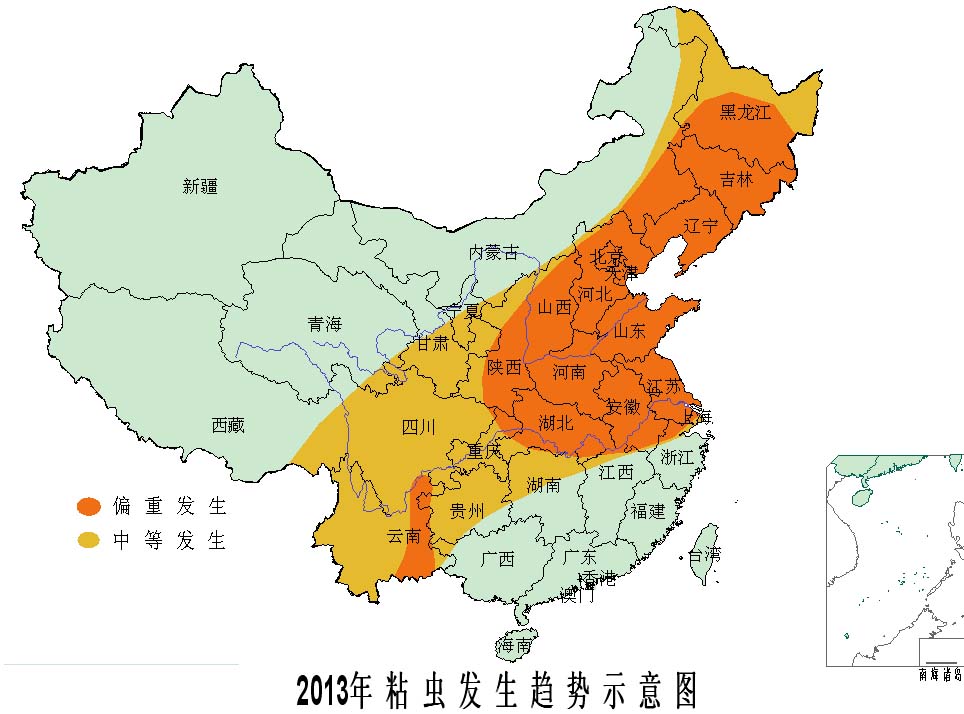 據(jù)全國(guó)農(nóng)作物病蟲(chóng)監(jiān)測(cè)網(wǎng)調(diào)查,2012年?yáng)|北、華北三代粘蟲(chóng)大發(fā)生,防治后殘留種群數(shù)量仍然較大,秋季北方多地和南方部分地區(qū)監(jiān)測(cè)到明顯蛾峰,為2013年的發(fā)生積累了較高的蟲(chóng)源基數(shù)。8月末至9月初,吉林公主嶺和長(zhǎng)嶺、遼寧彰武、內(nèi)蒙古通遼、河北欒城和北京延慶等地高峰日單燈誘蛾量達(dá)300~1448頭;8月30日至9月6日,山東北隍城島出現(xiàn)大量遷飛過(guò)境粘蟲(chóng),日誘蛾量達(dá)萬(wàn)頭以上;9月6日至23日,上海奉賢出現(xiàn)明顯蛾峰,月累計(jì)誘蛾量為2185頭,是2007~2011年平均值的35倍。2012/2013年冬季,華南、西南和江南南部氣溫偏高,對(duì)越冬代粘蟲(chóng)發(fā)生較為有利;2013年春季,江淮大部降水偏少,對(duì)一代粘蟲(chóng)發(fā)生有抑制作用,但黃淮北部、西南地區(qū)西部降水偏多,有利于當(dāng)?shù)匾淮诚x(chóng)發(fā)生為害。近年來(lái)我國(guó)玉米種植規(guī)模逐年擴(kuò)大,為粘蟲(chóng)提供了極為豐富的食源;仡櫸覈(guó)歷史上粘蟲(chóng)發(fā)生嚴(yán)重的1989年和1998年,翌年發(fā)生程度仍然較重,因此,2013年其維持較重發(fā)生態(tài)勢(shì)的幾率較高。如2013年夏季北方降水偏多,仍會(huì)造成粘蟲(chóng)偏重以上發(fā)生局面。