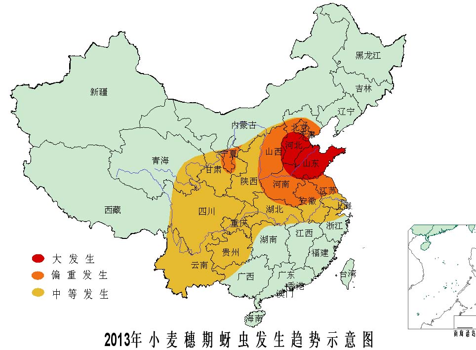 在河北、山東大發(fā)生,華北、黃淮的其他麥區(qū)、江蘇和安徽沿淮和淮北、寧夏偏重發(fā)生,長(zhǎng)江中下游、西南和西北大部麥區(qū)中等發(fā)生,全國(guó)發(fā)生面積2.5億畝。