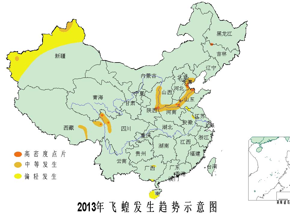 據(jù)全國(guó)農(nóng)作物病蟲(chóng)監(jiān)測(cè)網(wǎng)調(diào)查,2012年?yáng)|亞飛蝗秋殘蝗面積與2011年持平,平均密度有所降低,但高密度點(diǎn)面積增加。河北、天津、山東、河南、陜西、山西、江蘇、安徽、遼寧、廣西、海南等11。▍^(qū)、市)東亞飛蝗秋殘蝗面積為919萬(wàn)畝,與2011年和近5年平均值持平,比2001~2010年平均值減少16.7%;畝平均殘蝗密度為9.5頭,比2011年減少20.1%,但畝平均殘蝗密度在100頭以上的高殘點(diǎn)片面積比2011年增加11.8%。亞洲飛蝗新疆殘蝗面積30萬(wàn)畝,與2011年持平。西藏飛蝗殘蝗面積63.4萬(wàn)畝,比2011年減少21.9%,但部分河谷地帶存在高密度殘蝗點(diǎn)片。2013年春季,華北、黃淮和華南南部氣溫偏高,華北、黃淮北部降水偏多,新疆北部氣溫正常,降水偏多,對(duì)東亞飛蝗和亞洲飛蝗蝗卵發(fā)育和蝗蝻出土有利;西藏東部和四川西部氣溫偏低、降水偏多,對(duì)西藏飛蝗出土和發(fā)生有一定抑制作用。