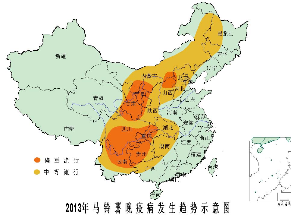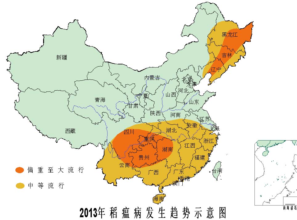 據(jù)分析,當(dāng)前我國(guó)西南、東北等稻瘟病常發(fā)區(qū)水稻主栽品種抗病性普遍不高;全國(guó)馬鈴薯主產(chǎn)區(qū)感病品種種植面積在60%以上,且由于多年連茬種植,病菌群體的變異導(dǎo)致品種抗性減弱;東北、華北主栽玉米品種對(duì)大斑病抗性普遍較差。各地主栽的品種均有利于上述病害的發(fā)生流行。稻瘟病、馬鈴薯晚疫病和玉米大斑病是典型的氣候型病害。水稻分蘗和抽穗期,氣溫適宜,陰雨連綿或霧多霧濃,稻瘟病會(huì)大流行;2013年春季西南地區(qū)西部降水偏多,有利于馬鈴薯晚疫病的發(fā)生流行,西北、華北馬鈴薯種植區(qū)8、9月份若陰雨連綿或多霧、多露,田間易出現(xiàn)中心病株,若隨后仍保持日暖夜涼的高濕天氣,病害將在一星期內(nèi)蔓延至全田,造成病害大流行;東北和華北春玉米區(qū),玉米生長(zhǎng)期易滿(mǎn)足病害對(duì)溫度的要求,如遇多雨多霧或連續(xù)陰雨,大斑病就會(huì)快速流行,造成嚴(yán)重的產(chǎn)量損失。