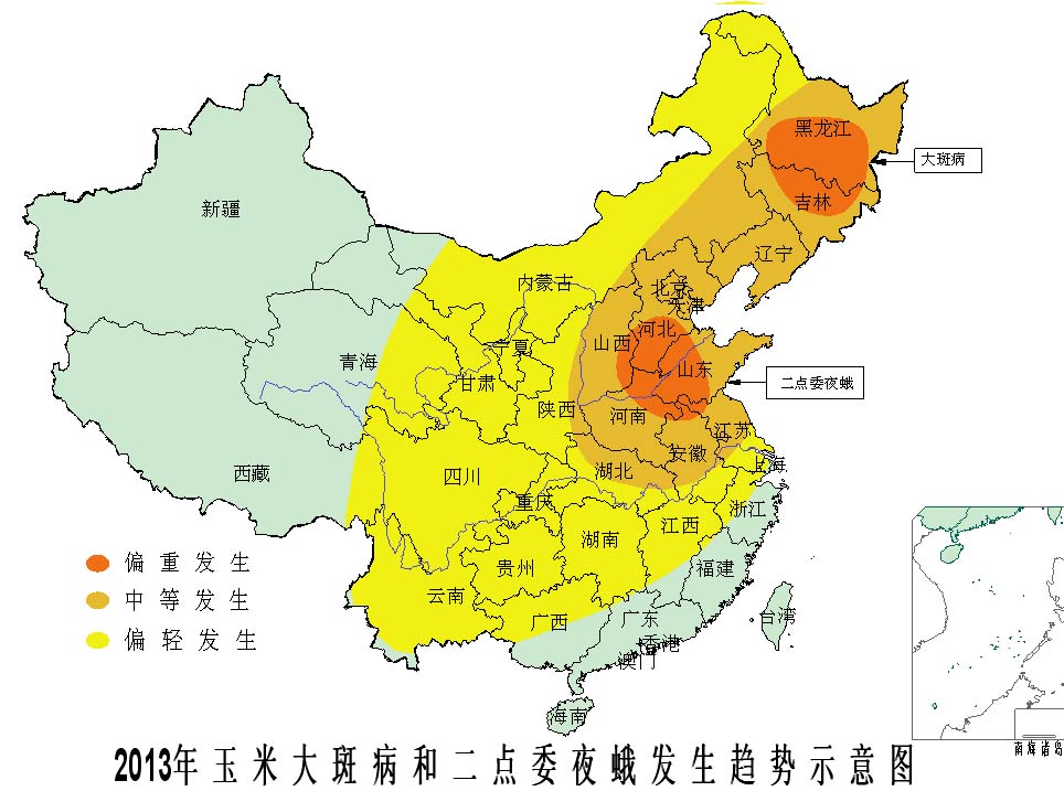 據(jù)河北、山東、河南等6省2012年冬前調(diào)查,二點(diǎn)委夜蛾越冬基數(shù)普遍低于2011年,一般蟲(chóng)量每平方米不足0.2頭,種群數(shù)量總體有所回落。但河北存在每平方米達(dá)9頭的高密度區(qū)域,且2012年二點(diǎn)委夜蛾在黃淮海部分夏玉米區(qū)發(fā)生區(qū)域擴(kuò)大,因此2013年一旦幼蟲(chóng)發(fā)生高峰期與玉米苗期吻合,且遇適宜降水,仍將對(duì)夏玉米生產(chǎn)造成一定威脅。