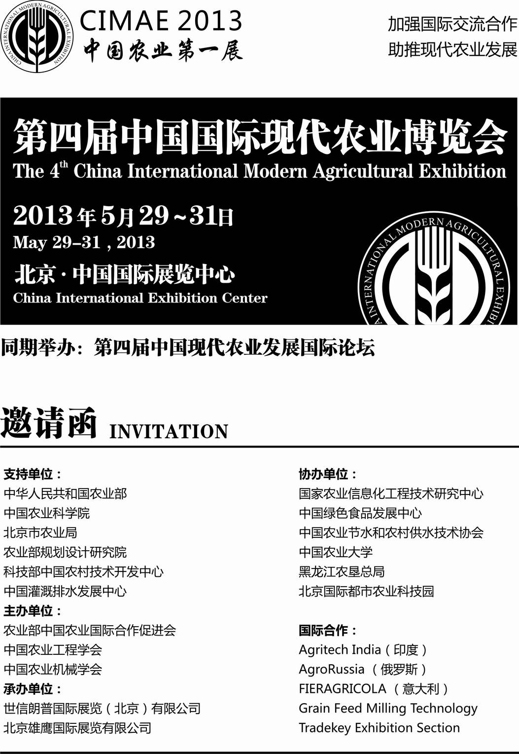 由農業(yè)部中國農業(yè)國際合作促進會、中國農業(yè)工程學會與中國農業(yè)機械學會聯合主辦,世信朗普國際展覽(北京)有限公司、北京雄鷹國際展覽有限公司聯合承辦的“第四屆中國國際現代農業(yè)博覽會 (CIMAE 2013) ”將于 2013 年 5 月 29 日 至 31 日在北京•中國國際展覽中心(老館)舉行,預計展出面積 20000 平米,將匯聚超過 500 家國內外農業(yè)相關展商 , 展示現代農業(yè)新產品與新技術,博覽會同期將舉辦內容豐富的高端論壇、展商技術交流會、新產品發(fā)布會等多項重要活動。 CIMAE 將更加重點突出國際化和品牌化,同時也將邀請更多的國外行業(yè)組織機構組團到會參觀、采購與交流,使 CIMAE 在促進國際交流、合作與貿易,推動我國農業(yè)現代化健康快速發(fā)展發(fā)揮更加積極的作用。