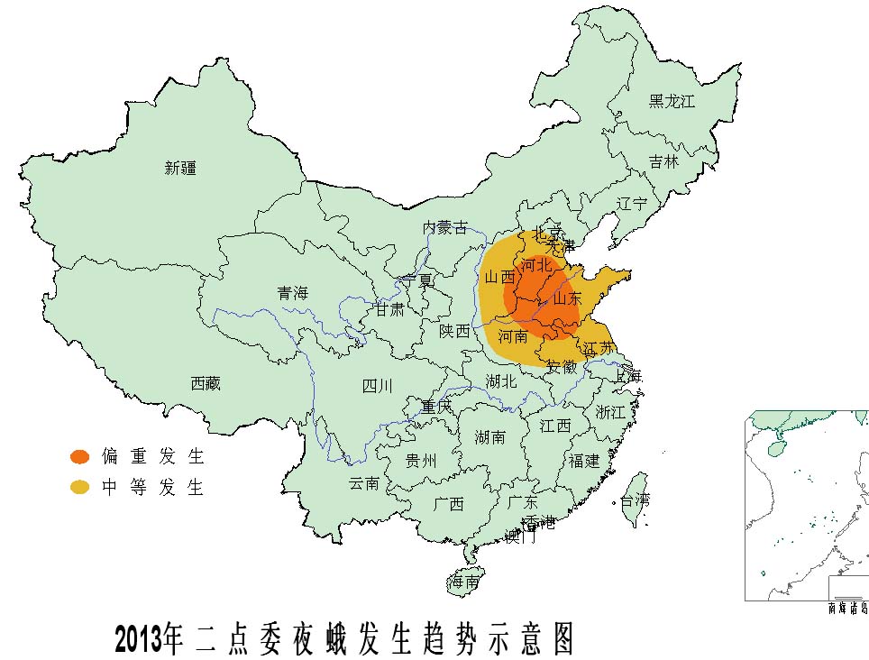 據(jù)國家氣候中心預(yù)測,2013年春季氣溫,黑龍江、吉林大部、內(nèi)蒙古東部較常年同期偏低,全國其余大部地區(qū)氣溫接近常年同期或偏高;黑龍江東部、吉林大部、遼寧東部、山東大部、河南大部、湖北北部、安徽北部、江蘇北部降水較常年同期偏多,其中吉林東部降水偏多2~5成;全國其余大部地區(qū)降水較常年同期偏少。以上氣候條件將有利于東北和黃淮地區(qū)玉米螟的化蛹和羽化,也有利于一代粘蟲在江淮、黃淮麥區(qū)的發(fā)生危害。夏季,如遇降水偏多天氣,將有利于粘蟲、二點委夜蛾、大斑病、褐斑病等病蟲害發(fā)生危害;如降水少、氣溫高,則有利于蚜蟲、葉螨、雙斑螢葉甲、棉鈴蟲等害蟲的發(fā)生危害。