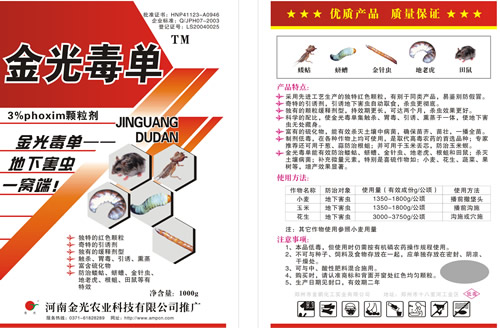 采用先進(jìn)復(fù)合肥造粒工藝生產(chǎn)的獨(dú)特紅色顆粒劑—金光毒單,可有效防治螻蛄、蠐螬、金針蟲、地老虎、線蟲和田鼠;殺滅土壤病菌;補(bǔ)充微量元素,特別是喜硫作物,如:小麥、花生、蔬菜、果樹等作物,增產(chǎn)效果顯著。